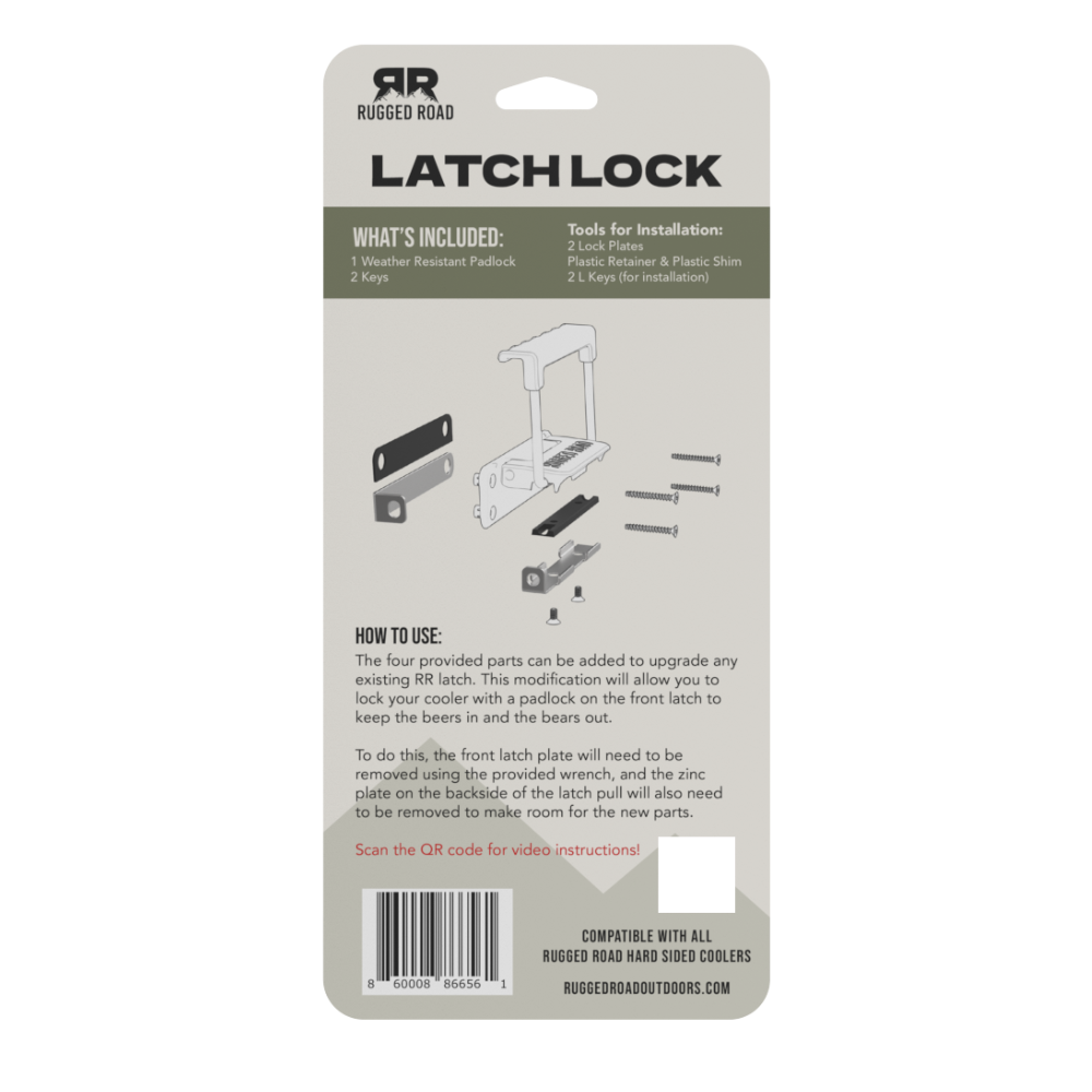The Latch Lock is custom designed to fit your Rugged Road cooler, keeping everything you want in, in (and everything you don't, out)! Installation is quick and easy. Have peace of mind knowing your cooler's contents are safe and secure!